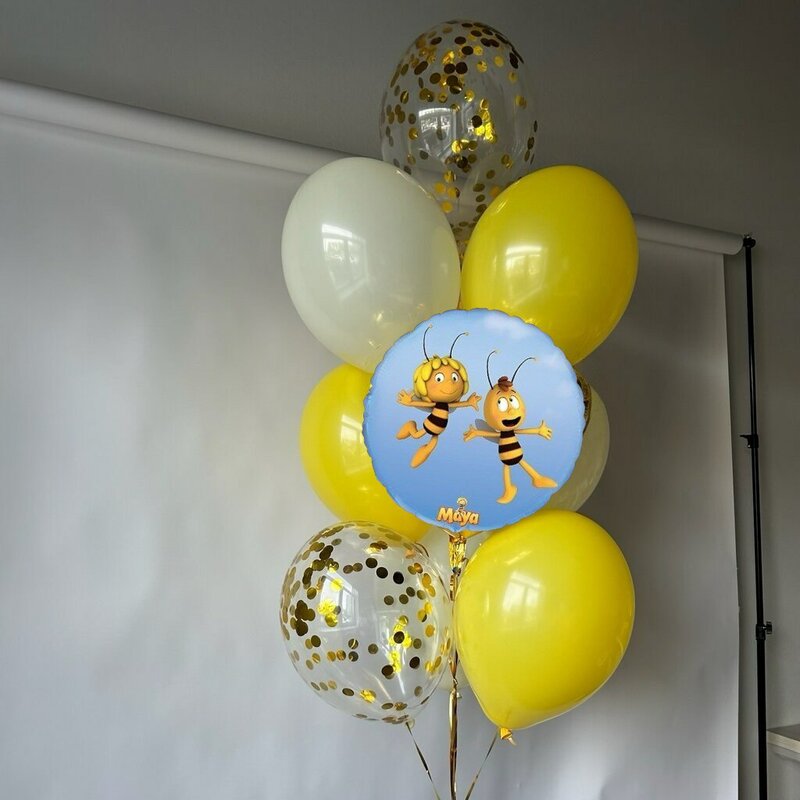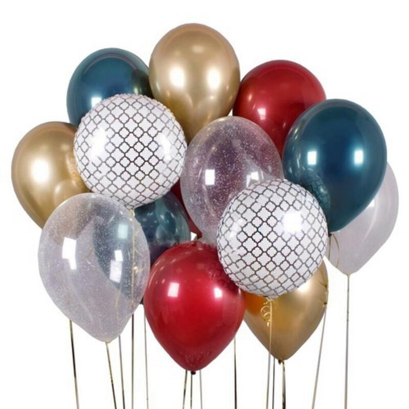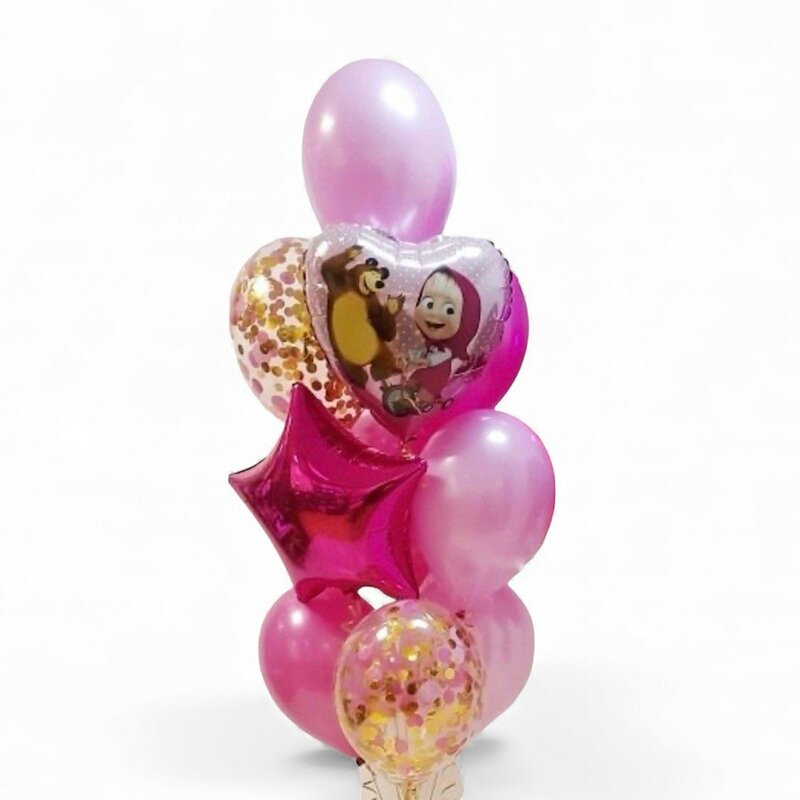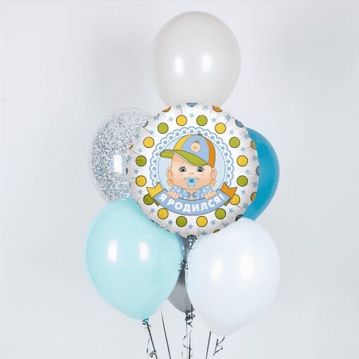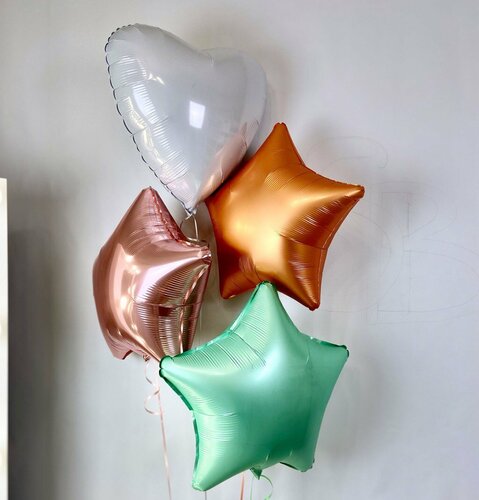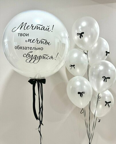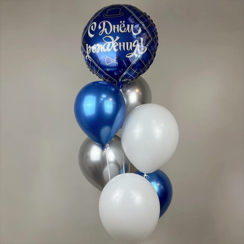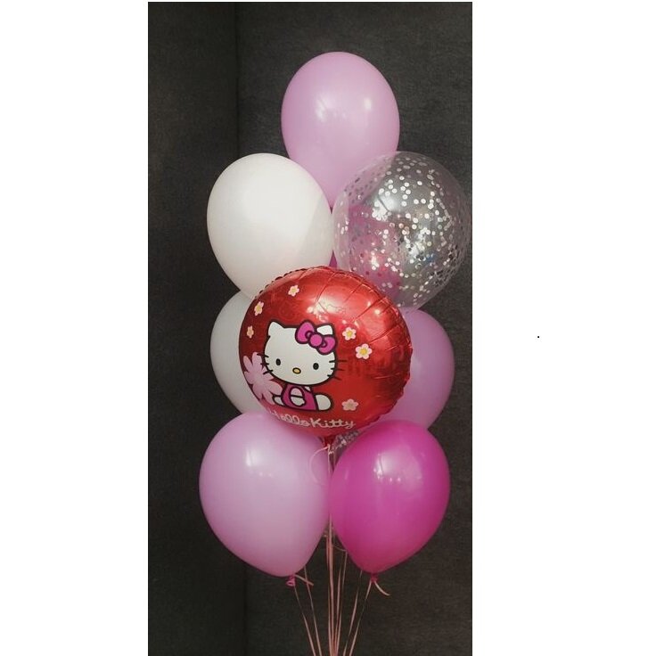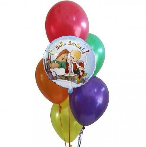 - фонтан из 10 шаров (1 круг с рисунком 45 см, 2 хром 30 см, 1 стеклянный 30 см, 1 металлик 30 см, 1 перламутр 30 см, 4 пастель 30 см)